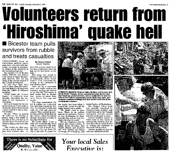 A massive international response was mounted to assist and the UK was involved with volunteer teams which included 8 members of the Thames Valley Medical and Rescue Unit led by Terry Carter, who were, on arrival at Istanbul, despatched to Gokuet a city roughly the size of Portsmouth.