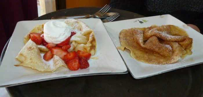I eventually plumped for the Banana and Chocolate pancake and when it arrived wondered if I had done the right thing! There were two large pancakes and also a serving of cream. It was absolutely delicious and I had a hard time finishing it, but I did. As one of the customers said “it is only once a year after all”.